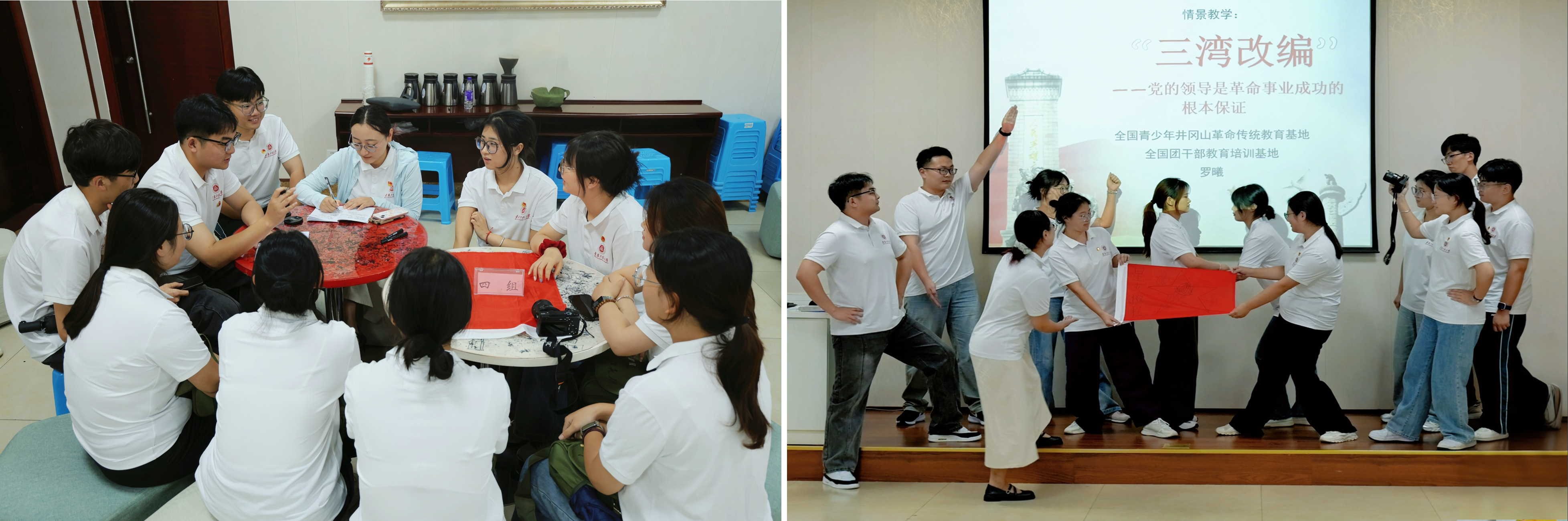 实践团走进基地情景教室,参与“三湾改编”沉浸式教学。授课老师全面讲述其历史背景与重大意义后,队员通过角色扮演、现场体验,模拟还原“支部建在连上”“官兵平等”等关键场景,并自主设计班名、班旗、口号和班歌。带队老师指出,情景教学让历史‘活’了起来,使同学们真切认识到坚持党的领导、密切联系群众的重要性。